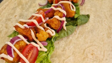 Wrap mit pikant frittiertem Blumenkohl, Salat, Tomaten und roten Zwiebeln mit Chili-Mayo (vegane Option verfügbar)